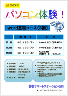 ☝ ワード基礎コースは、3回(3日間)連続した内容です。①・②・③の参加がお勧めです。