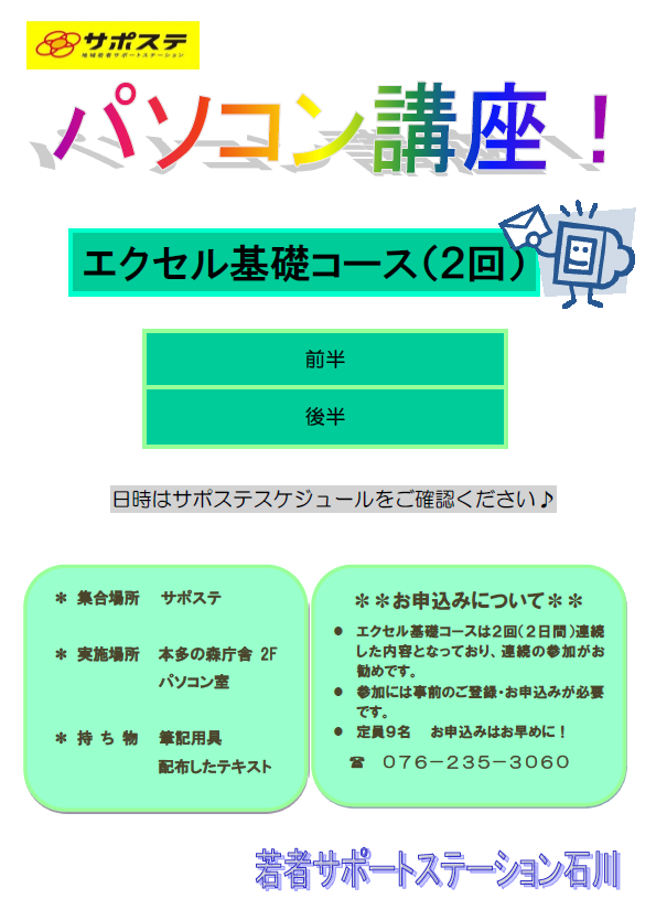 ☞ エクセル基礎コースは、前半―後半と連続した内容となっていますので、