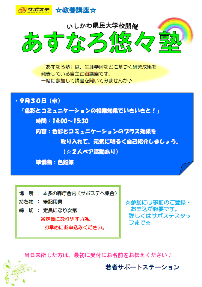 ☆★いしかわ県民大学校開催の「あすなろ悠々塾」に一緒に参加しましょう~☆★